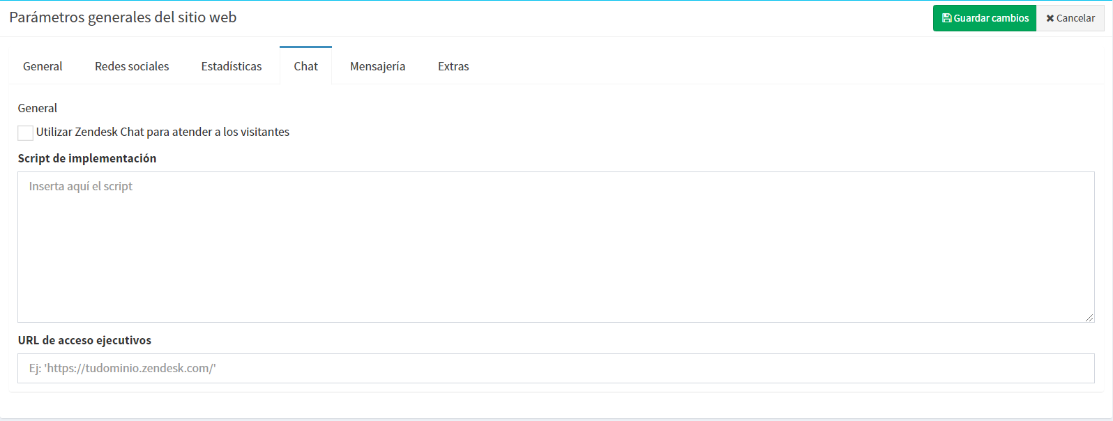 En la pestaña Chat, podrás definir el comportamiento del manejador de chats disponible en tu sitio web