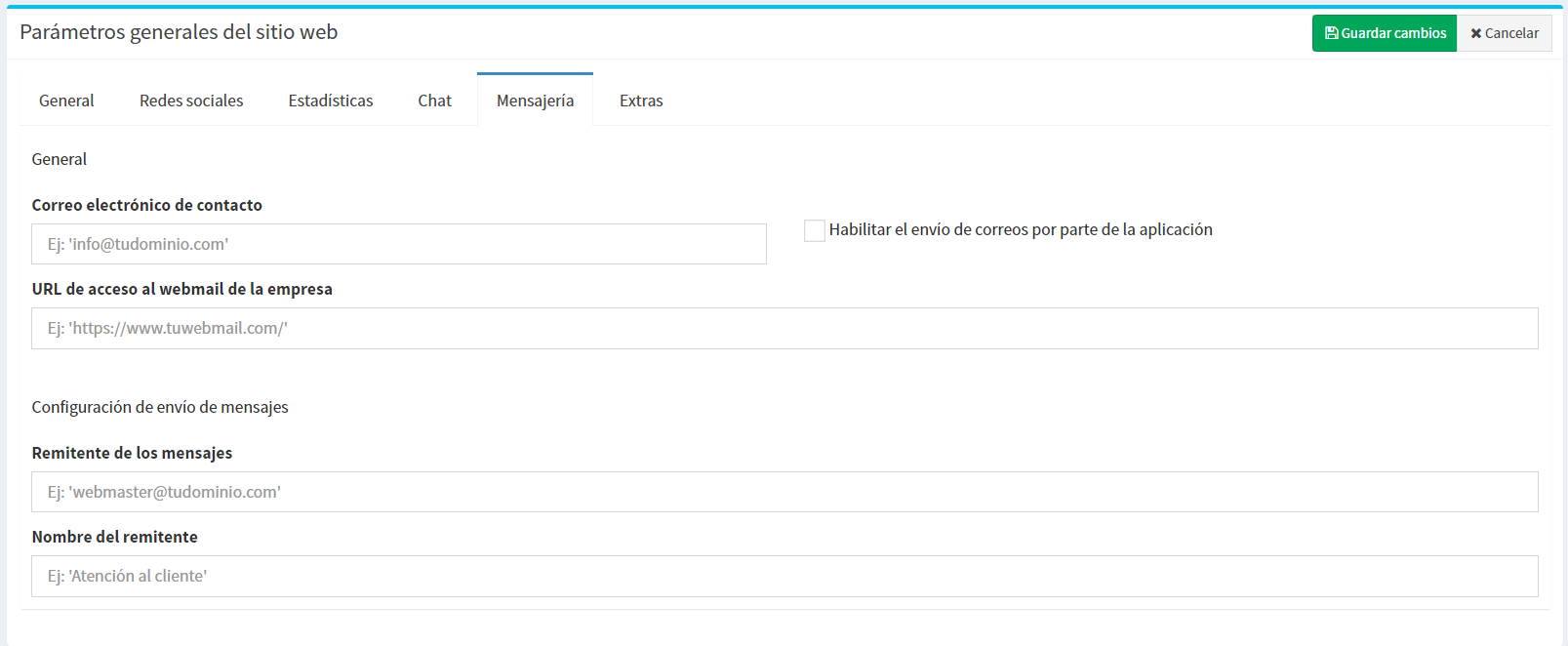 En la pestaña Mensajería, podrás definir el comportamiento de las notificaciones de correo electrónico que recibirás de tu sitio web.