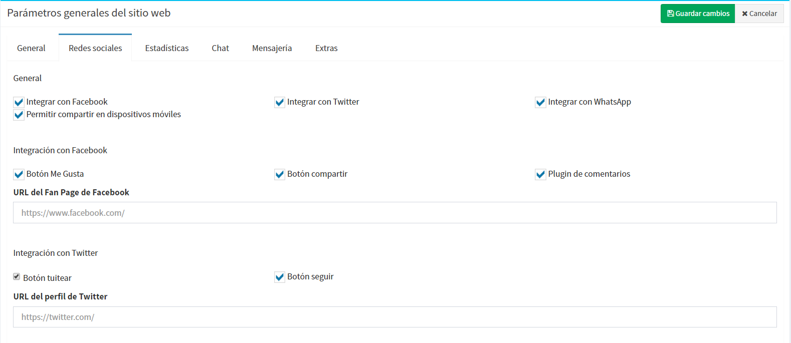 En la pestaña Redes sociales, podrás definir el comportamiento de la integración de los elementos sociales con tu sitio web.