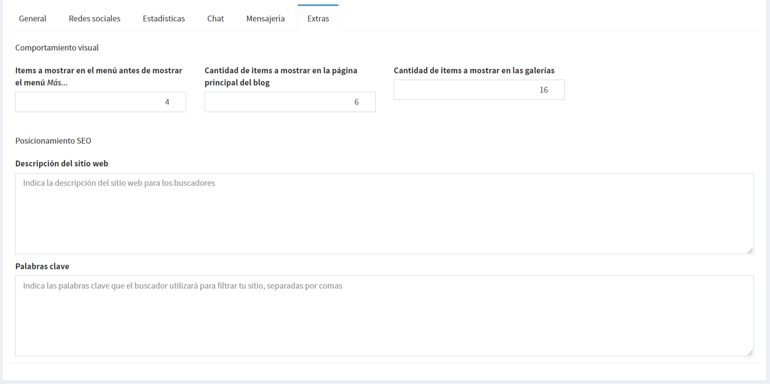Finalmente, en la pestaña Extras, encuentras los parámetros para la cantidad de páginas que se muestran al construir el menú del sitio de forma dinámica, la cantidad de ítems a mostrar en las páginas principales de Noticias y Galerías, además de las palabras claves para el posicionamiento en Motores de búsqueda (posicionamiento SEO, o Search Engine Optimization)