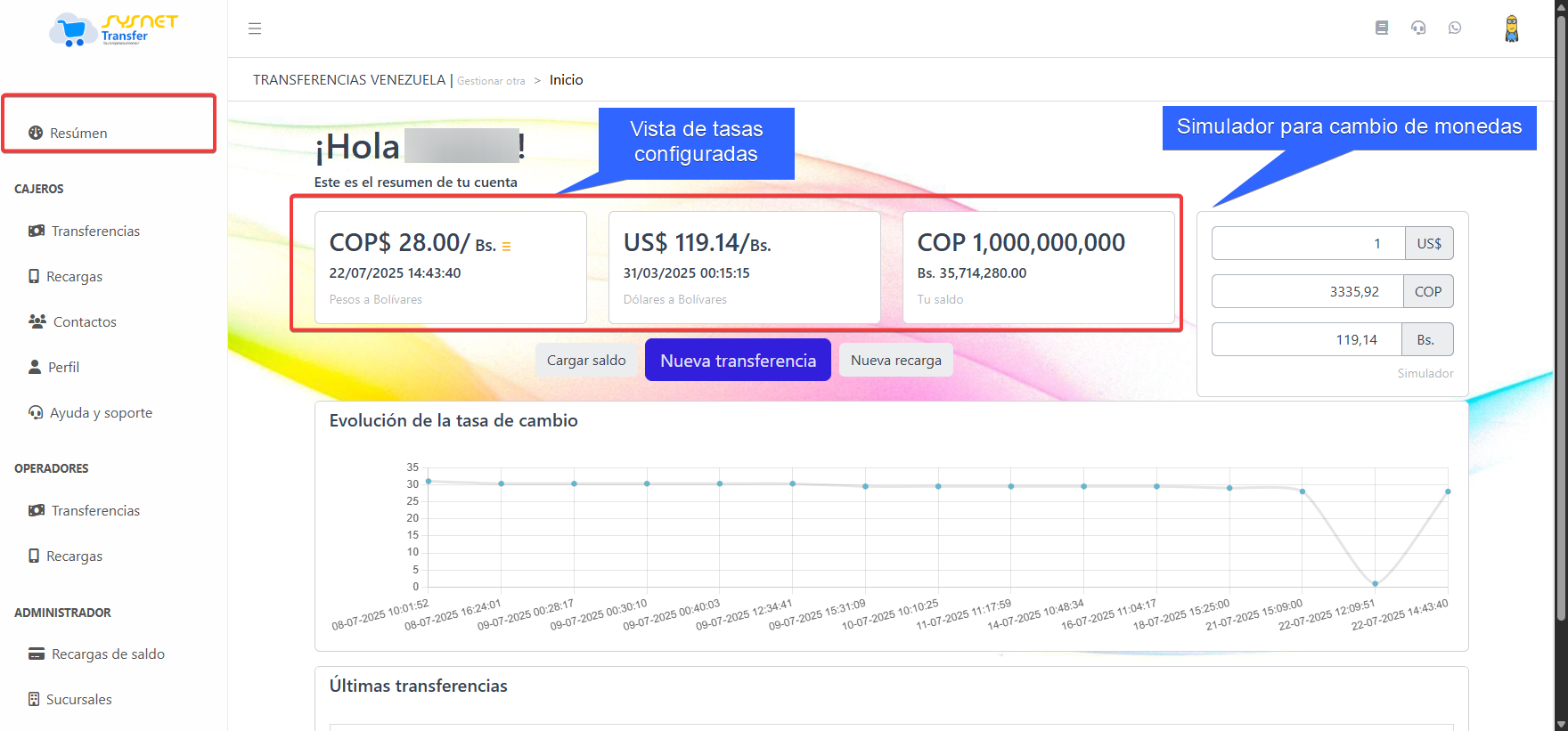 Podrá observar las tasas modificadas de manera manual en el sistema, luego cuenta con un simulador para realizar conversiones de monedas. Por otro lado, podrá ver en los gráficos del lado inferior los cambios en un periodo de tiempo de la tasa y las últimas transacciones realizadas.