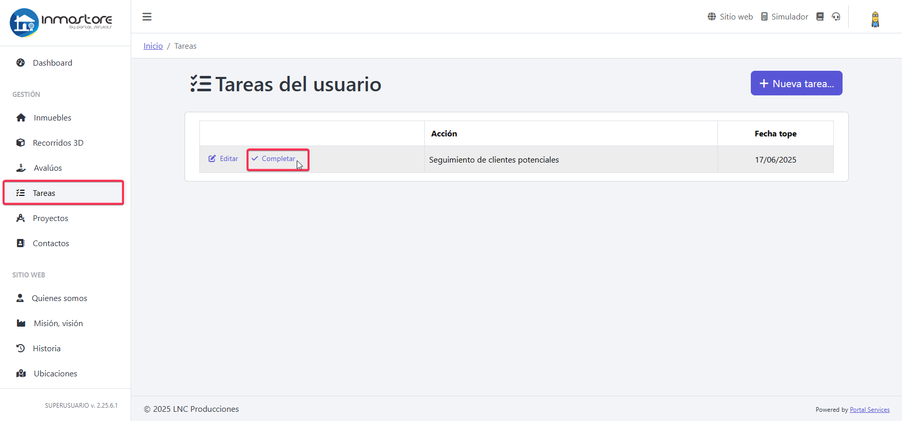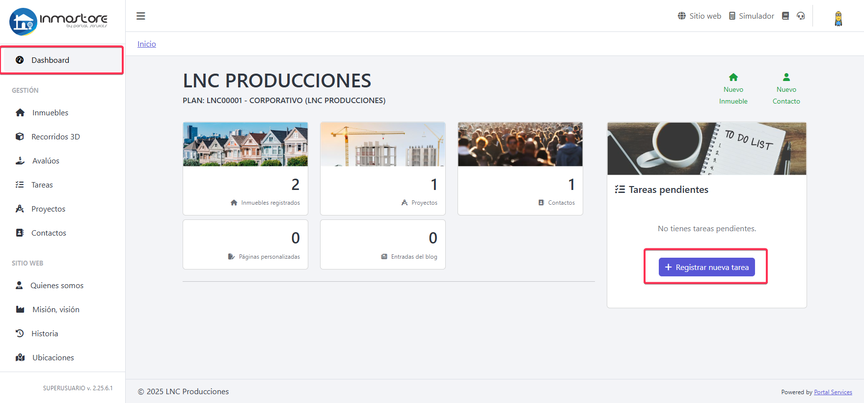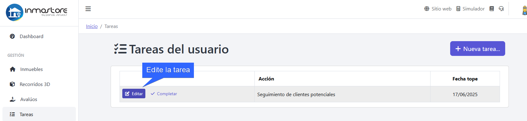 Desde el panel principal ingrese a la sección de tareas para gestionar el día a día de sus actividades dentro de la inmobiliaria.