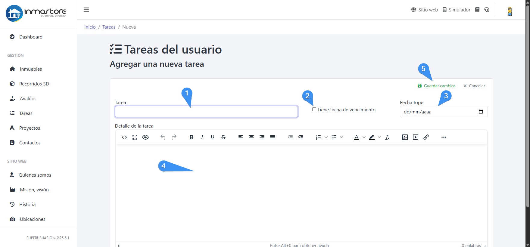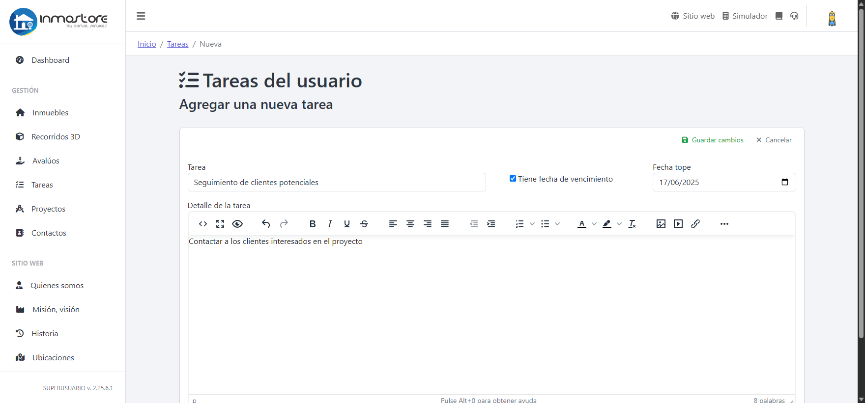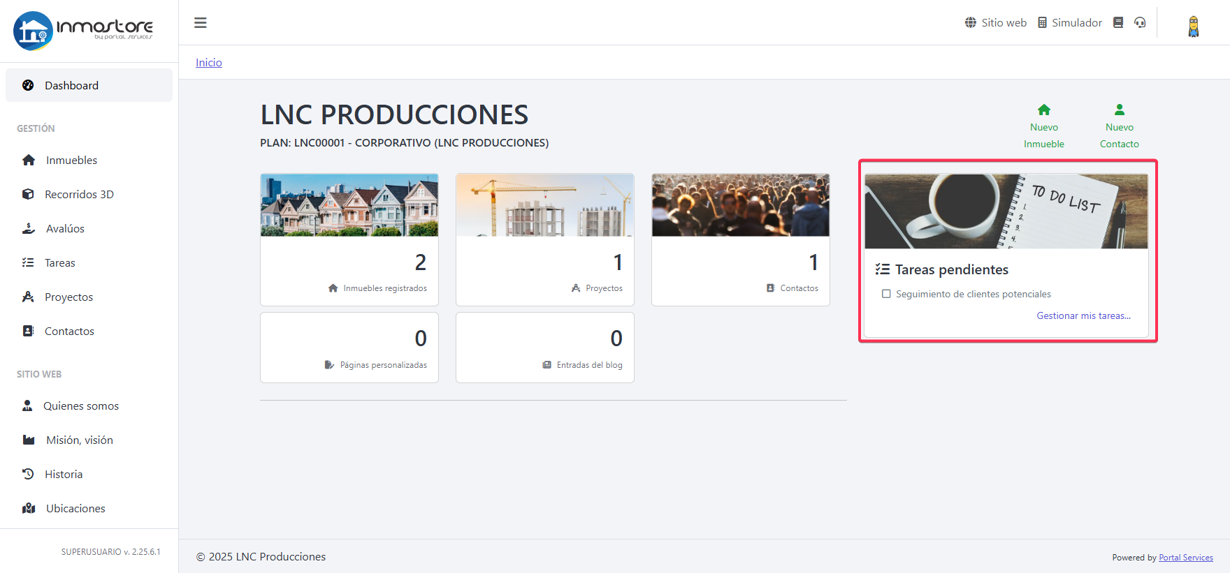 Desde el panel principal ingrese a la sección de tareas para gestionar el día a día de sus actividades dentro de la inmobiliaria.