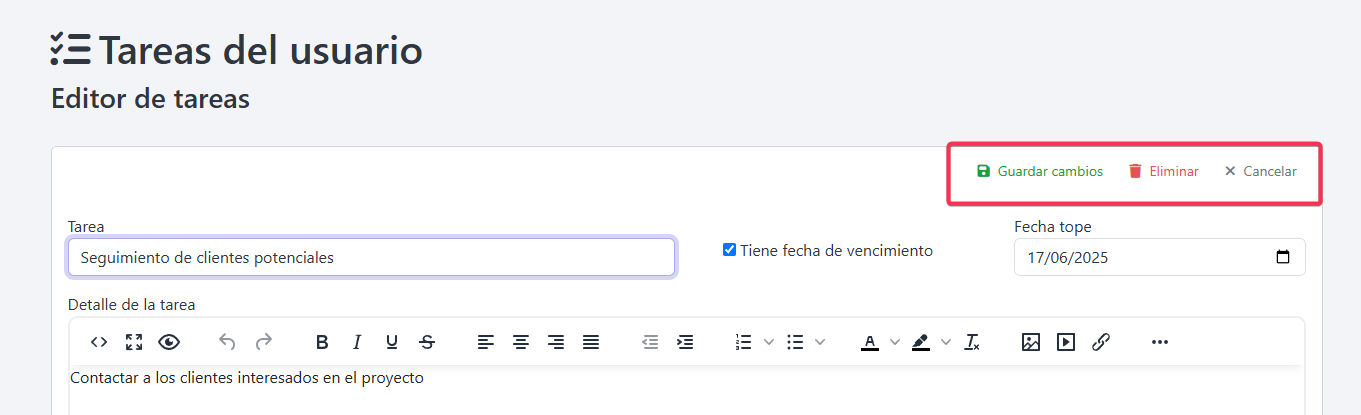 En la edición de la actividad puede guardar los cambios, eliminar o cancelar la acción sobre la tarea creada.