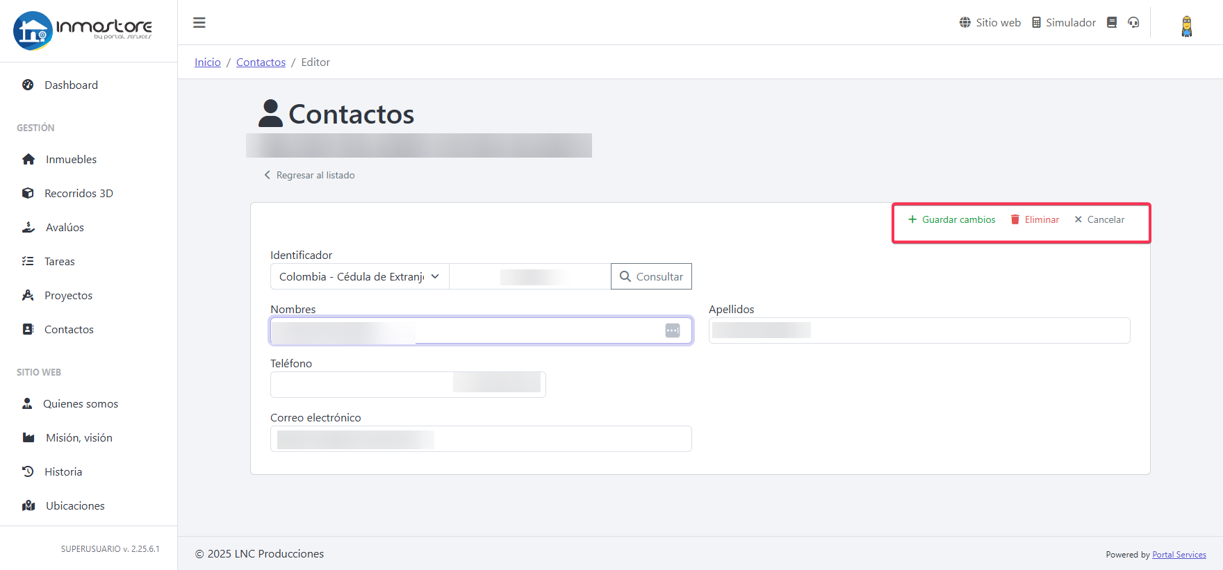 Edite los campos que requiere modificar, puede guardar los cambios, eliminar o cancelar.