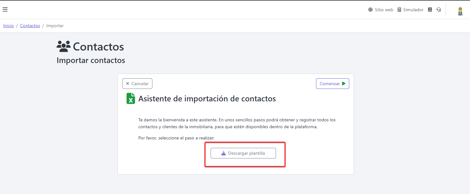 2. Haga clic en comenzar para proceder a cargar el archivo con la información: