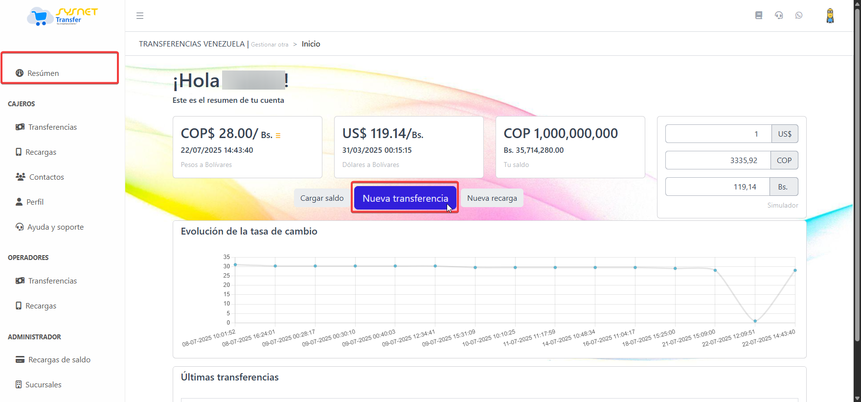 Luego de ingresar sus credenciales visualizará el panel principal, haga clic en el botón de "Nueva Transferencia":