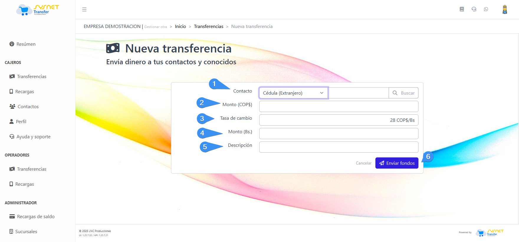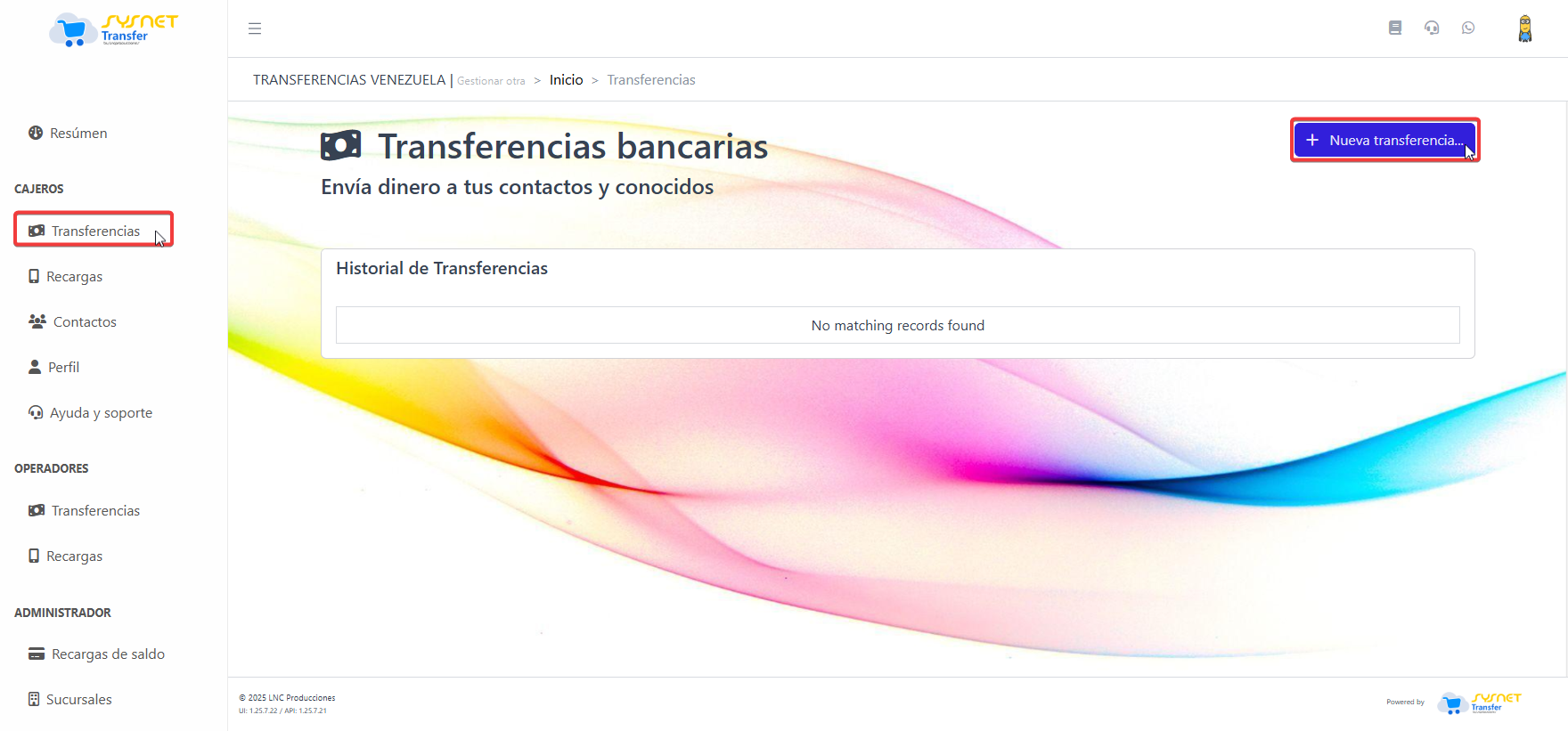 La siguiente manera, es dando clic en la sección CAJEROS > "Transferencias" del menú del lado izquierdo: